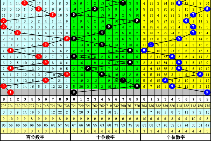 大中小分析:在组选0-9号码分散图中,前10期小 号(0-2区段)出现9枚奖号,中号(3-6区段)出现13枚奖号,大号(7-9区段)出现8枚奖号,上期大中小区间离别出现1枚奖号,本期看好中号码走冷,翔实3-6区段不落号。