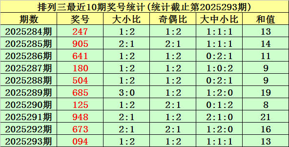 上期总结:成列三第2025293期奖号为:094。奖号类型:组六,和值:13,奇偶比:1:2,跨度:9,大小比:1:2。