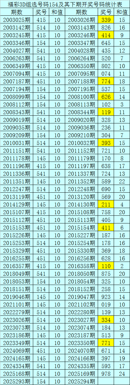 二、组选分析:历史上组选号码154开出了48次,其下期奖号永诀为:339-826-414-645-435-520-802-074-774-537-626-102-119-328-236-304-393-721-170-638-724-589-690-569-211-758-405-411-187-178-369-628-110-875-325-258-923-019-139-334-184-513-771-671-397-593-978,其开出期数和下期奖号统计为: