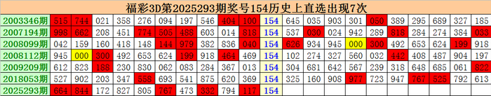 解密:最初,直选154开出之后,10期内开出豹子号0次,2003年-2025年在开出直选154之后,10期内组三累计出现12次,组三在异日第1-5期出现概率为67%,组三在异日5-10期出现的概率为83%。