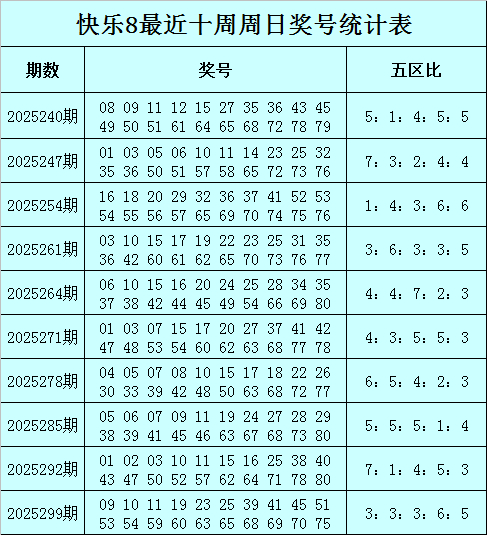 福彩舒畅8第2025299期(上周日)开奖归来:09 10 11 19 23 25 39 41 45 51 53 54 59 60 63 65 68 69 70 75,其中奖号五区比为3:3:3:6:5。