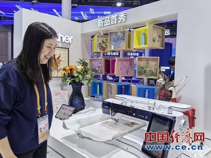 图为“全勤生”Brother电脑绣花·缝纫一体机AVENEER EV1进博会首秀。中国经济网记者魏金金摄