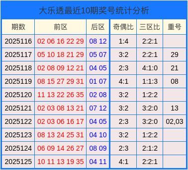 重号分析:上期前区无重号。最近10期有5期开出重号组合,开出重号组合的概率为50.00%。本期瞻望有契机开出重号,参考重号为19。