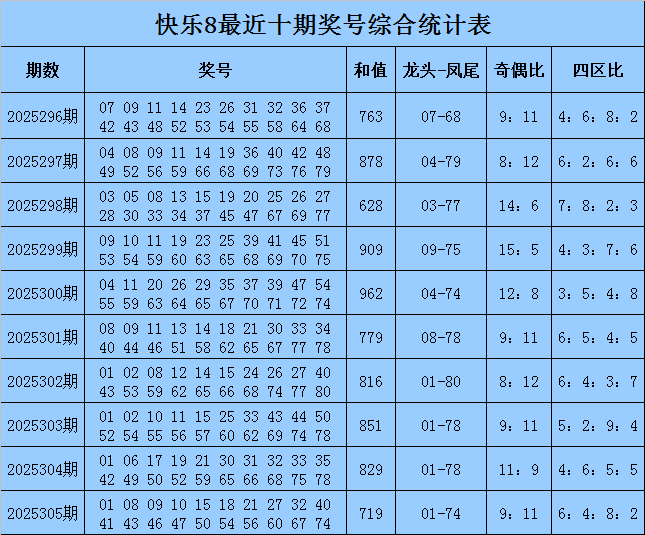 福彩振作8第2025305期开奖回来:01 08 09 10 15 18 21 27 32 40 41 43 46 47 50 54 56 60 67 74,其中奖号和值为719,跨度为73,奇偶比开出9:11,012路比开出7:6:7,四区比开出6:4:8:2。
