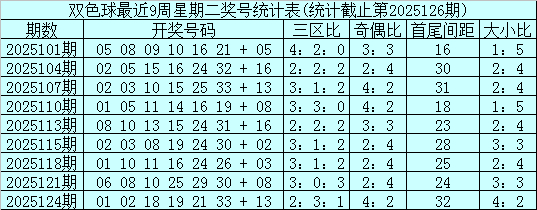 奇偶比分析:最近9周星期二奇偶红球出现个数比为26:28,奇偶红球落号基本合手平,本期瞻望偶数红球热出,奇偶比参考2:4。