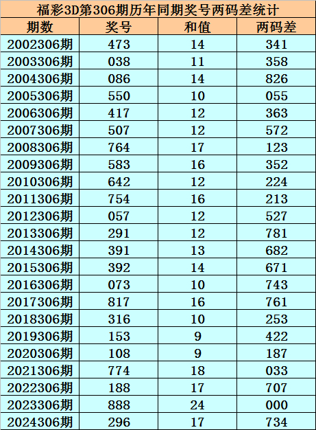 福彩3D第306期,历史上期开出23次奖号,其奖号鉴识为:473、038、086、550、417、507、764、583、642、754、057、291、391、392、073、817、316、153、108、774、188、888、296,奖号两码合差鉴识开出:
