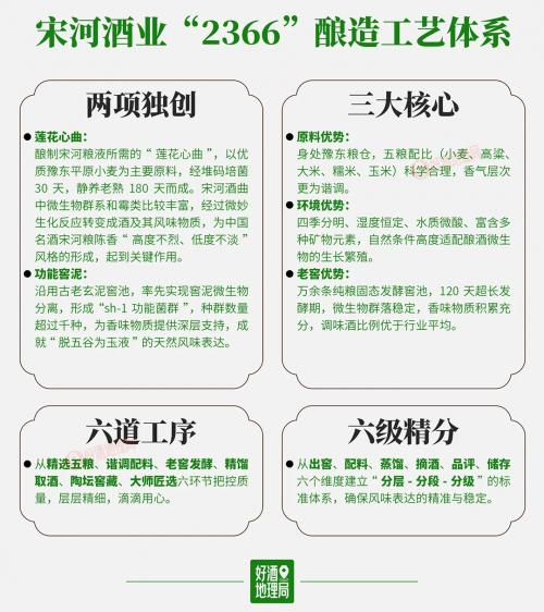 厂区和工艺端也完成升级。宋河酒厂获评国度AAA级旅游景区,老窖池连续酿酒,万吨坛养区酒香充足。传统“端午制曲、春秋双酿”工艺被定型传承,同期“九老共酿”的理念确保粮香、陈香、窖香三香会通,实现经典风韵延续。